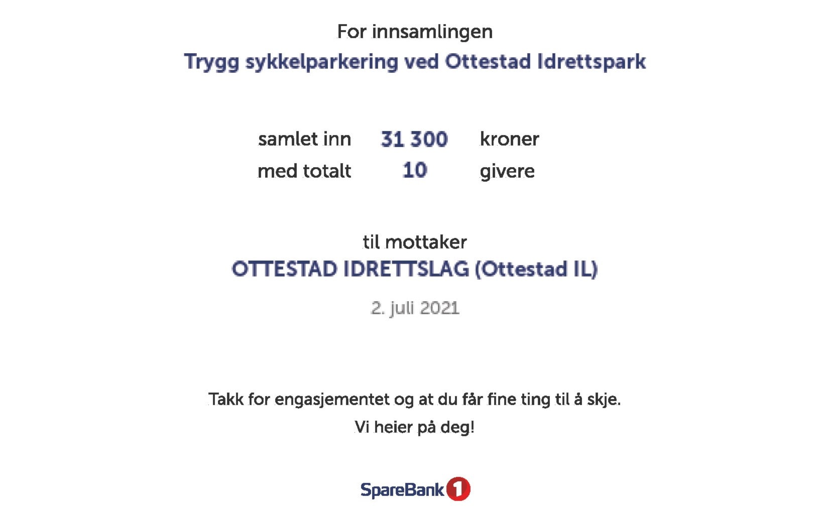 Vi er utrolig takknemlige for gavemidlene som har kommet inn til sykkelparkering ved klubbhuset. Private givere har bidratt med 1300 kr, og Sparebank1 har bidratt med 30.000 kr gjennom prosjektet "Alle henda tilbake".